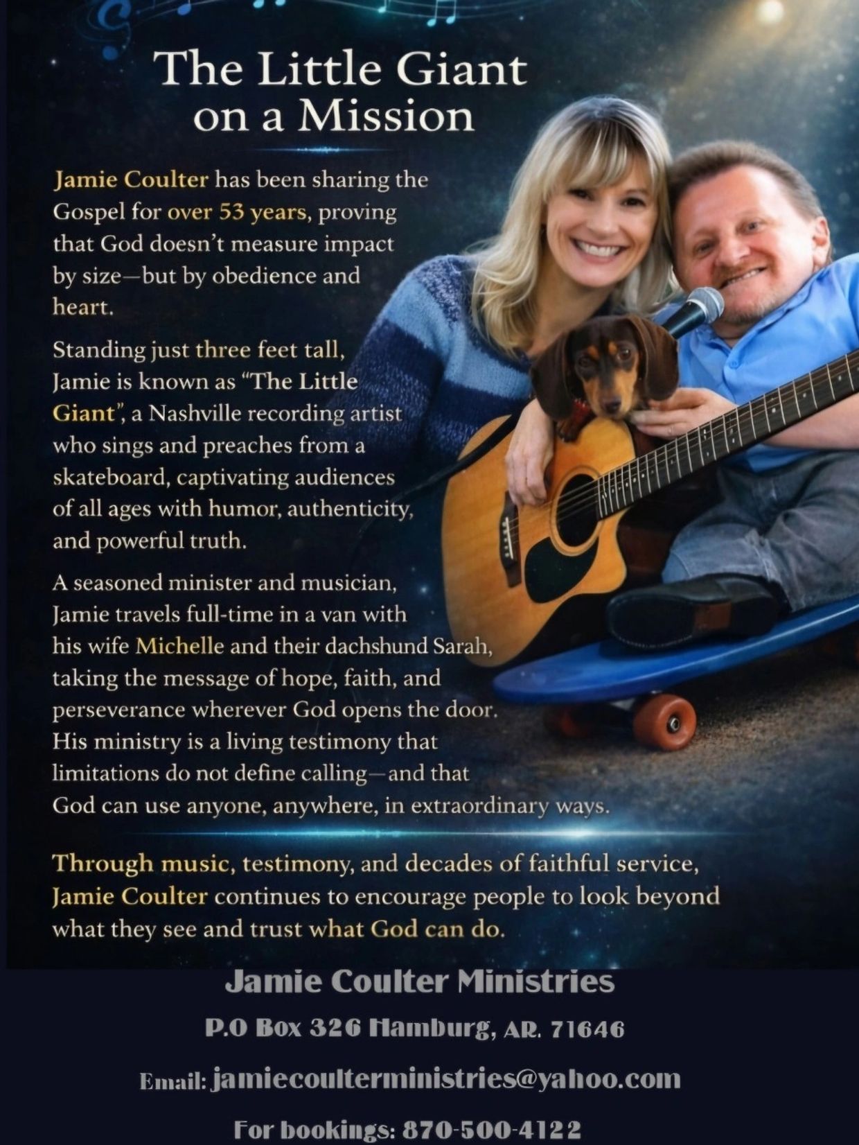 Some people know him as the “Little Giant of Gospel Music,” and others know him as The Skateboard Preacher.” Jamie Coulter is a 3ft. tall man who uses his passion for music to help people reconnect and find peace. He strives to cultivate positivity through his soulful religious songs in his universal message – meant to make people feel comfortable. He has been traveling and singing and telling people of the Lord Jesus for over 50 years now. Jamie has work with almost all major southern gospel groups around. The Florida Boys, The Hoppers, Greenes and Hinsons are just a few. Jamie has also been blessed to work with country music artists as well. In 1995 country singer David Frizzell met Jamie, and by Jamie's out going personality, Frizzell created a cartoon series called Jamie Boo. Jamie has also worked with country music artists such as Jimmy Fortune, Les Taylor, Billy Walker, and Marty Raybon just to name a few. Jamie's goal is not to sing with the biggest country or Gospel artists out there. His main goal is to share with as many people as possible about his Lord Jesus Christ.